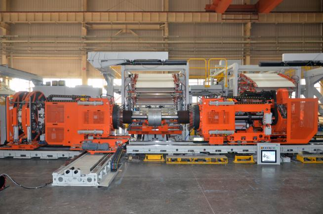 57吋子午線(xiàn)巨型工程輪胎成型機長(cháng)45米,寬32米,高6.8米,擁有36項專(zhuān)利技術(shù),進(jìn)行了15項技術(shù)攻關(guān),實(shí)現12項創(chuàng )新升級,優(yōu)化升級了自動(dòng)指型正反包裝置,更有效提高胎胚的品質(zhì);具備智能化的胎體層膠料糾偏裝置;具備新型卸胎裝置,能夠根據胎胚形狀、大小調節,操作更簡(jiǎn)單高效且不傷胎胚。達成更高效、更精準的生產(chǎn)方式。