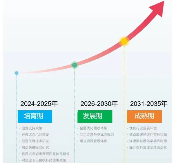 廢塑料化學(xué)循環(huán):7.34 億噸背后的 6800 億元產(chǎn)值科學(xué)技術(shù)即是生產(chǎn)力,當行業(yè)還在熱衷于物理循環(huán)利用領(lǐng)域,新的“市場(chǎng)藍?!鼻娜欢?。過(guò)去的四月份,隨著(zhù)《廢塑料化學(xué)循環(huán)綜合性研究報告》的發(fā)布(以下簡(jiǎn)稱(chēng)“報告),“化學(xué)循環(huán)”關(guān)鍵詞再度被熱議。那么廢塑料化學(xué)循環(huán)的市場(chǎng)空間在哪里,效益如何,該如何抓住“風(fēng)口””。 廢塑料化學(xué)循環(huán)市場(chǎng)前景 《廢塑料化學(xué)循環(huán)綜合性研究報告》由國家發(fā)展和改革委員會(huì )宏觀(guān)經(jīng)濟研究院經(jīng)濟體制與管理研究所發(fā)布,旨在為國家廢塑料治理和循環(huán)利用方面提供策略參考?! ∠葋?lái)看一組國內數據:2023年,我國廢塑料約4300萬(wàn)噸被焚燒或填埋,實(shí)際上其中50%能夠實(shí)現化學(xué)循環(huán),相當于開(kāi)發(fā)一個(gè)超過(guò)6000萬(wàn)噸的油田,然而卻未得到利用。我國現還有10億噸的存量塑料垃圾,如果利用化學(xué)循環(huán),相當于低成本開(kāi)發(fā)超大規模的“城市油田”?! 蟾骖A計,到2035年,中國塑料制品年產(chǎn)量將達到1.55億噸,如果其中化學(xué)循環(huán)利用率達到30%,相當于再造兩座大慶油田,產(chǎn)值將超過(guò)1600億元?! ≡賮?lái)看一組全球數據:預計到2035年,全球塑料產(chǎn)量將達到7.34億噸,通過(guò)化學(xué)循環(huán),將全球廢塑料回收利用率由目前的9%提高到30%,每年將新增循環(huán)再生塑料1.5億噸,產(chǎn)值將超過(guò)6800億元。 化學(xué)循環(huán)生命周期效益分析 廢塑料化學(xué)循環(huán)是指以廢塑料為原料,采用化學(xué)方法將廢塑料轉化為一定比例的塑料單體以及副產(chǎn)其他化學(xué)組分,并進(jìn)一步生產(chǎn)塑料及其他化工產(chǎn)品的過(guò)程?;瘜W(xué)循環(huán)技術(shù)主要采取裂解法、解聚法、氣化法為主的主流技術(shù)工藝,技術(shù)已發(fā)展成熟?! 』瘜W(xué)循環(huán)技術(shù)針對塑料產(chǎn)量46%左右的軟包裝類(lèi)、膜袋類(lèi)等低值廢塑料具有較高的回收利用效益。而目前,我國對軟包裝類(lèi)、膜袋類(lèi)等低值廢塑料的處理方式主要是填埋和焚燒?! ?經(jīng)濟效益評價(jià) 根據“報告”估算,在當前化學(xué)循環(huán)主流工藝技術(shù)水平下,1噸廢塑料,其合成樹(shù)脂的平均產(chǎn)率約為42%,芳烴、烷烴類(lèi)平均產(chǎn)率約為17%,汽柴油平均產(chǎn)率約為10%,重質(zhì)燃料油平均產(chǎn)率約為6%。按合成樹(shù)脂均價(jià)7500元/噸、芳烴均價(jià)6000元/噸、烷烴均價(jià)2500元/噸、汽柴油均價(jià)5500元/噸、重質(zhì)燃料油均價(jià)3900元/噸的階段性平均出廠(chǎng)價(jià)測算,1噸廢塑料化學(xué)循環(huán)產(chǎn)品產(chǎn)值約為4550元/噸。綜合成本和收益,廢塑料化學(xué)循環(huán)簡(jiǎn)單綜合效益約為850元/噸,加上政府補貼約為950元/噸?! ?資源效益評價(jià) “報告”指出,按照原油到餾分油的提煉比例60%-70%測算,1噸廢塑料相當于節約0.9噸-1.0噸石油資源,同時(shí)還會(huì )副產(chǎn)0.033噸燃料氣,可替代0.22噸石油資源。綜合計算,1噸廢塑料化學(xué)循環(huán)相當于節約1.12噸-1.22噸石油資源,實(shí)現碳減排比例為22%?! ♂槍洶b類(lèi)、膜袋類(lèi)等低值廢塑料的化學(xué)循環(huán)利用,與焚燒利用方式和填埋處理方式比較,無(wú)論從經(jīng)濟效益、資源節約效益、碳減排方面,都具有明顯優(yōu)勢(下表所示),這必將是接下來(lái)我國會(huì )大力推進(jìn)的廢塑料循環(huán)利用方式?;瘜W(xué)循環(huán)/焚燒利用/填埋處置三種方式效益比較來(lái)源:《廢塑料化學(xué)循環(huán)綜合性研究報告》2024.4化學(xué)循環(huán)產(chǎn)業(yè)化推進(jìn)趨勢預判 “報告”預測,化學(xué)循環(huán)的產(chǎn)業(yè)化發(fā)展將分為培育期、發(fā)展期、成熟期,并做出了具體的時(shí)間劃分(見(jiàn)下圖所示),對每階段國家在化學(xué)循環(huán)產(chǎn)業(yè)的引導、支持、推進(jìn)等措施做出具體判斷。圖:廢塑料化學(xué)循環(huán)推進(jìn)路線(xiàn)圖來(lái)源:《廢塑料化學(xué)循環(huán)綜合性研究報告》2024.4 1培育期措施 出臺相關(guān)政策和行業(yè)發(fā)展指導意見(jiàn),明確鼓勵和支持化學(xué)循環(huán)產(chǎn)業(yè)發(fā)展。將選擇行業(yè)領(lǐng)軍企業(yè)開(kāi)展示范項目,選擇試點(diǎn)城市構建與化學(xué)循環(huán)相適應的回收體系,對試點(diǎn)企業(yè)和示范項目,給與補貼、財稅、用地方面的政策支持,支持企業(yè)承擔國家重點(diǎn)科技研發(fā)項目?! ?發(fā)展期措施 規范化市場(chǎng)和行業(yè)標準。制訂和完善廢塑料化學(xué)循環(huán)各類(lèi)標準體系,明確行業(yè)原材料收集運輸、廠(chǎng)址選擇、項目建設、技術(shù)工藝、產(chǎn)品質(zhì)量、三廢處理等相關(guān)標準和規范。建立溯源管理體系,鼓勵廢塑料化學(xué)循環(huán)再生料的使用?! ?成熟期措施 推進(jìn)化學(xué)循環(huán)產(chǎn)業(yè)鏈各類(lèi)市場(chǎng)主體創(chuàng )新發(fā)展。有序推進(jìn)填埋庫存廢塑料垃圾及國外廢塑料的化學(xué)循環(huán)利用。促進(jìn)化學(xué)循環(huán)利用的全球化,提升我國塑料污染治理的全球貢獻?! ≡诋斍拔锢砘